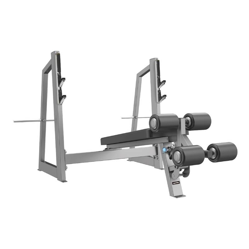 El banco olímpico declinado Línea Pro LYCAN permite a los usuarios realizar presiones en declive sin una rotación externa excesiva de los hombros. El ángulo fijo de la almohadilla del asiento proporciona un posicionamiento correcto, y la almohadilla de rodillo ajustable para las piernas garantiza la máxima adaptabilidad para usuarios de diferentes tamaños.variabilidad en el ejercicio.