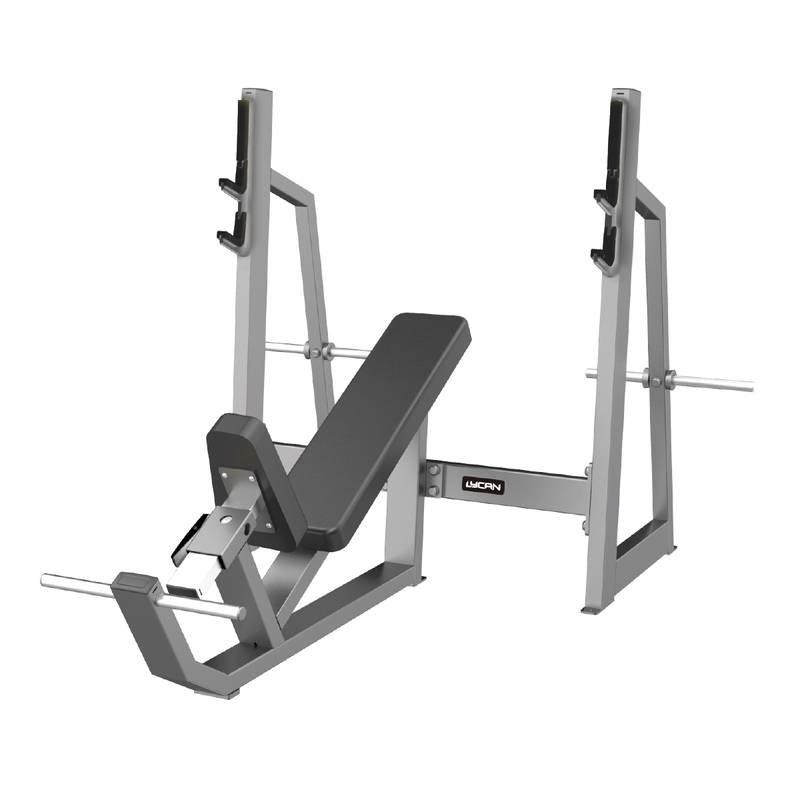 El banco olímpico inclinado Línea Pro LYCAN está diseñado para proporcionar un entrenamiento de prensa inclinada más seguro y cómodo. El ángulo fijo del respaldo ayuda al usuario a colocarse correctamente.