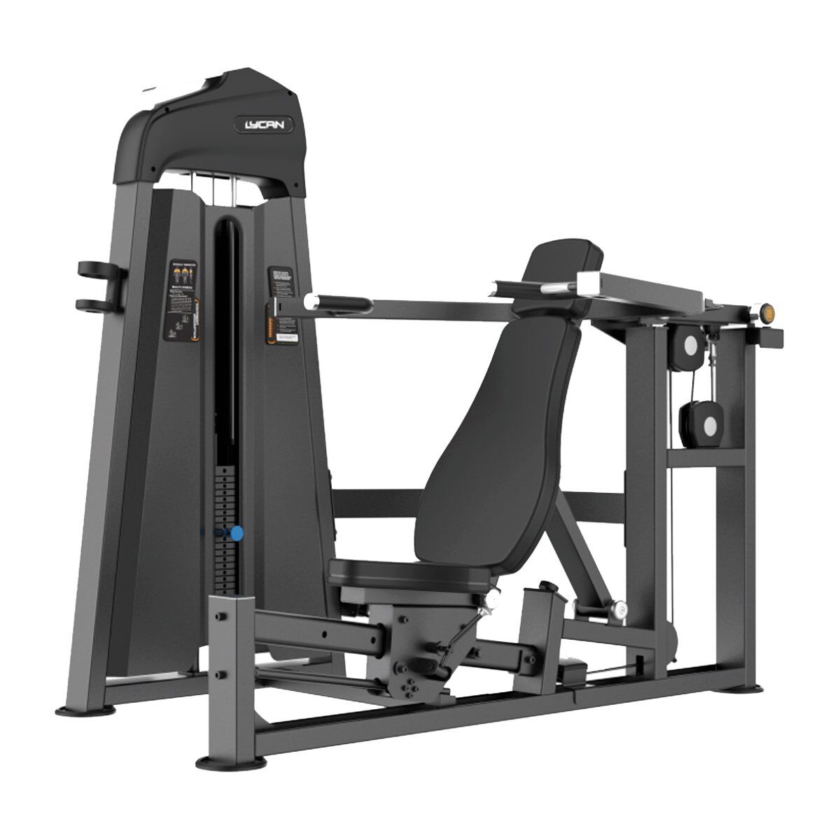 La Línea Pro – Dual Press de Pecho y Hombro LYCAN logra la integración de las funciones de las tres máquinas en una. En esta máquina, el usuario puede ajustar el brazo de presión y el asiento en para hacer Press de banca, Press oblicuo ascendente y Press de hombros. Las cómodas agarraderas de gran tamaño en múltiples posiciones, combinadas con el sencillo ajuste del asiento, permiten a los usuarios sentarse fácilmente en posición para realizar diferentes ejercicios.