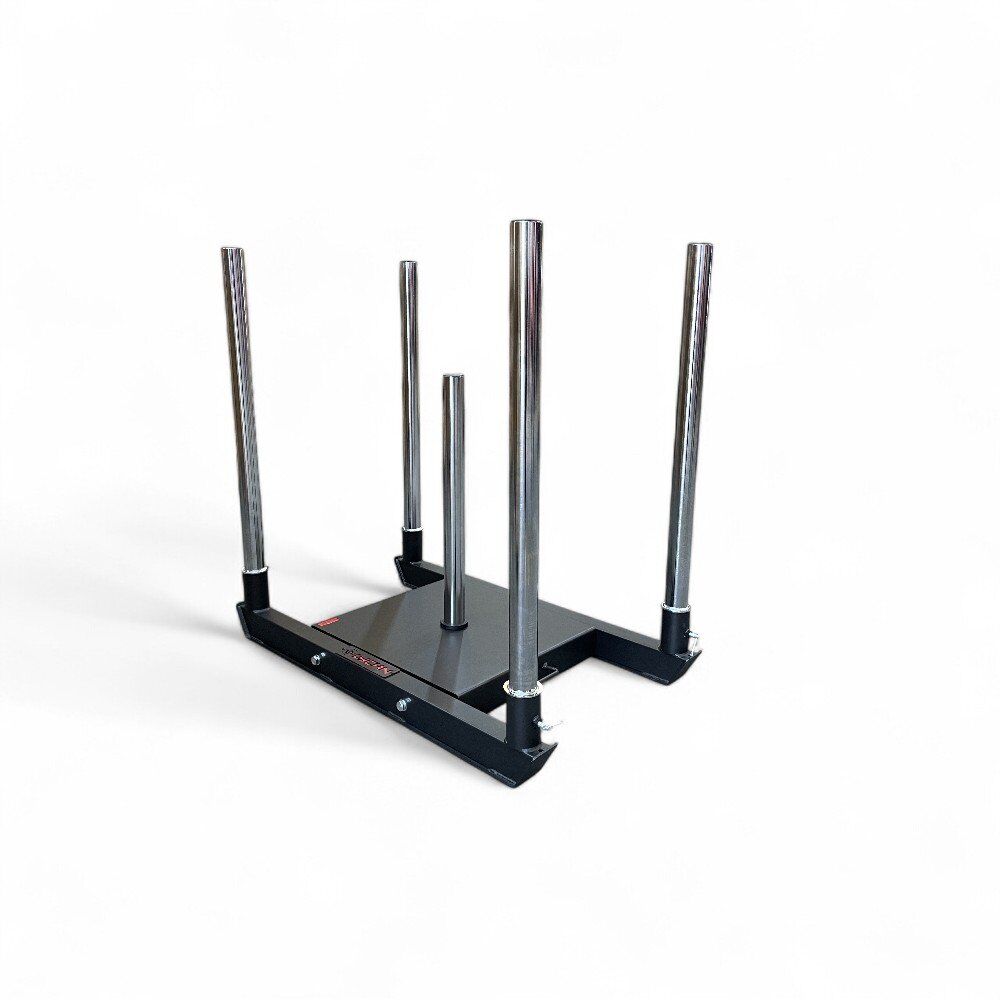 Trineo de empuje y arrastre con 5 postes, compatible con discos y arneses. Construcción robusta y diseño funcional para entrenamiento de fuerza y resistencia.